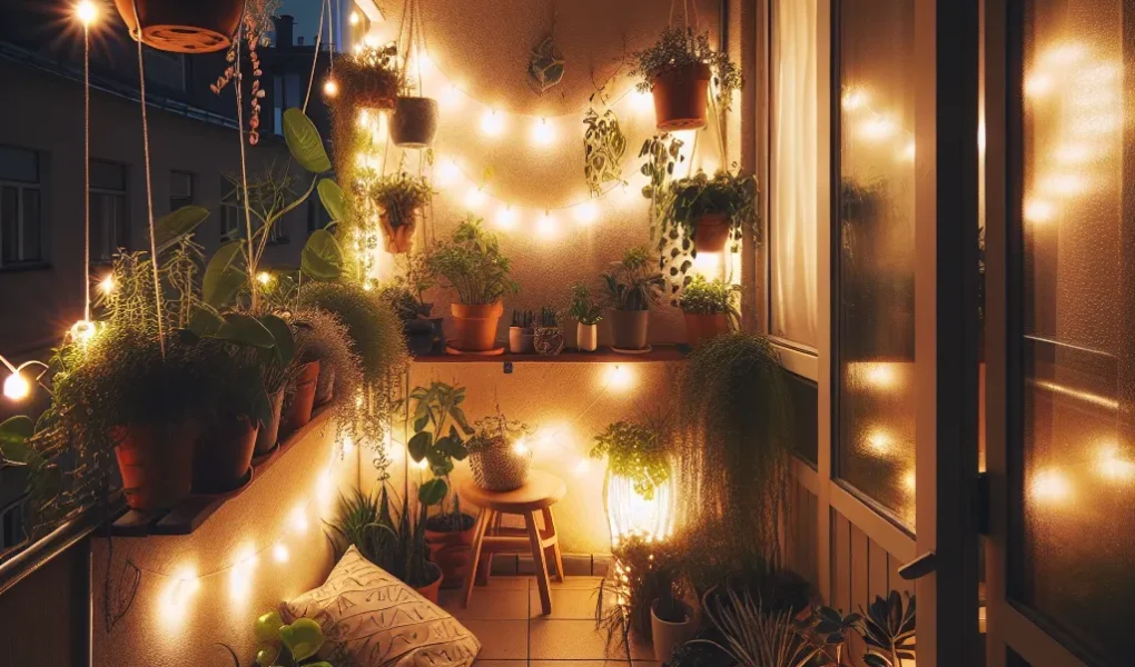 Najlepiej sprawdza się ciepłe, rozproszone światło: girlandy, lampki solarne lub niewielka lampa LED. Unikaj jednego mocnego źródła światła – na małym balkonie daje to efekt zbyt surowy.